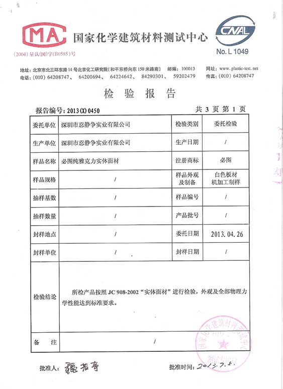 888集团welcome大厅纯雅克力检测报告1